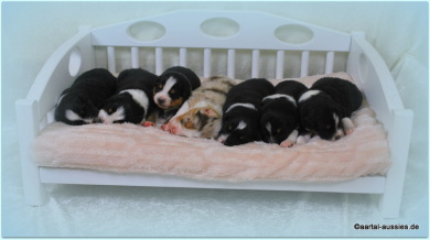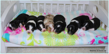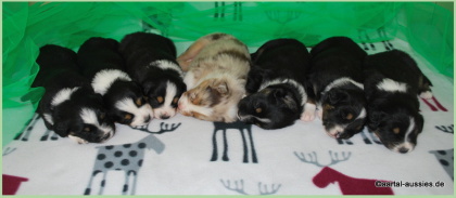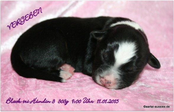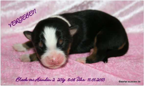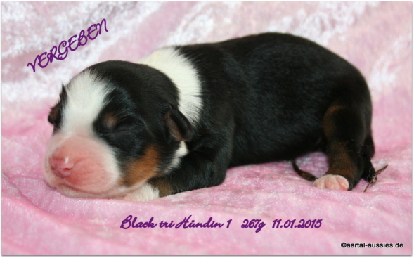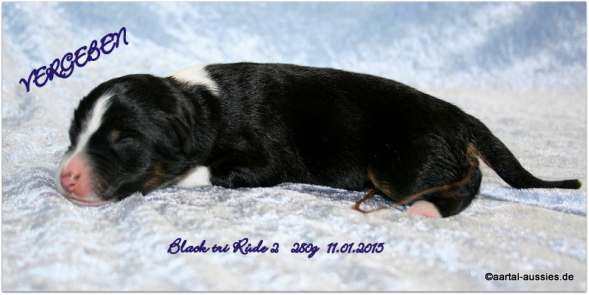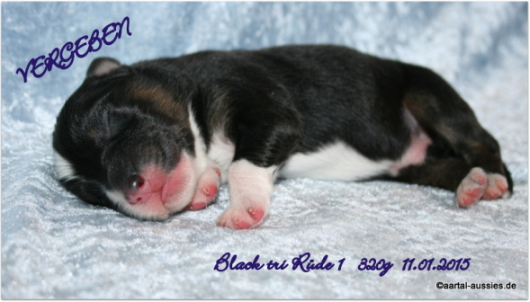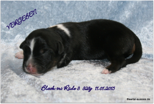 Black tri Bübchen Nummer 2 hat eine schmale Blesse, die ums Näschen etwas breiter ist. Sein Nackenfleck hat die Form eines Sternes und auch er hat vorne bds. Strümpfe und hinten bds.Söckchen an.