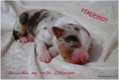 Eyecatcher des Wurfes ist dieser traumhaft dunkel gezeichnete red merle Rüde. Er hat eine breite Blesse, einen schönen Kragen, vorne weiße Stiefel und hinten Söckchen an.