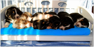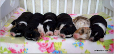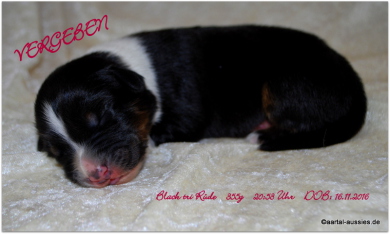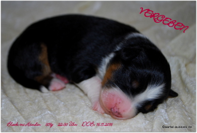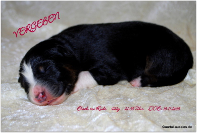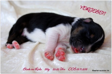 Unser erstgeborener Mysthical ist ein wunderschöner black tri Rüde mit einem jetzt schon sehr schönem Köpfchen und einer weißen Schwanzspitze. Er besitzt eine breite Blesse, sein weißer Halbkragen ist rechts, vorne hat er beidseits Stiefel und hinten Söckchen an.
