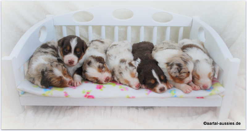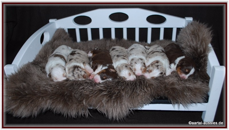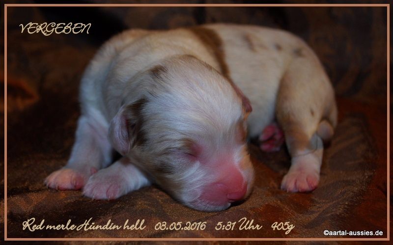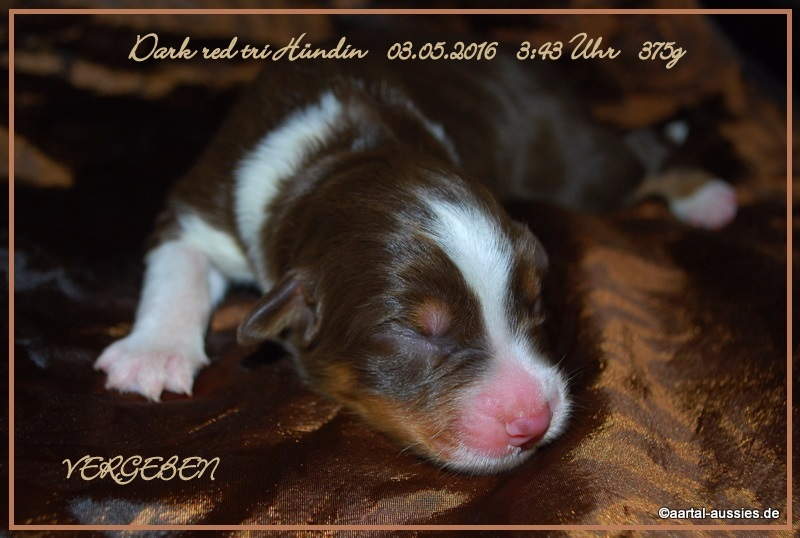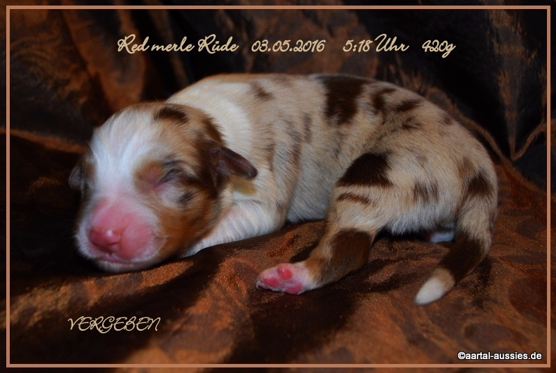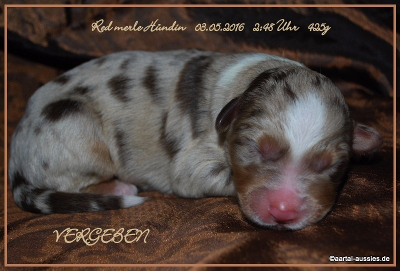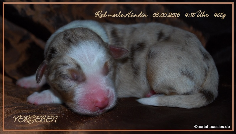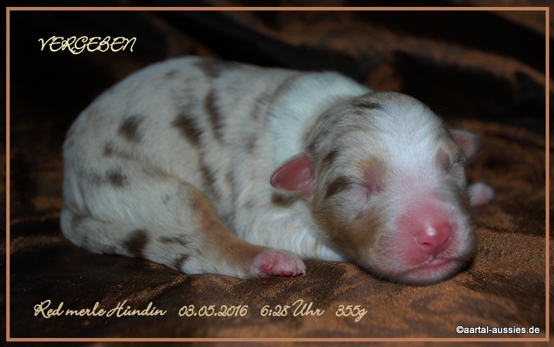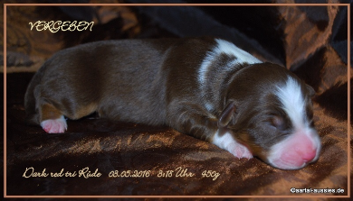 Traumhaft dunkle red merle Hündin mit satten Mistretta-Farben. Die Süße hat einen schmalen Kragen, der links nicht ganz geschlossen ist. Ihre Vorderbeinchen haben Kniestrümpfe, ihre Hinterbeinchen Sneakers an.