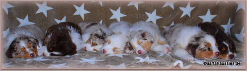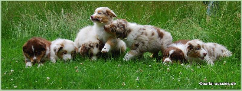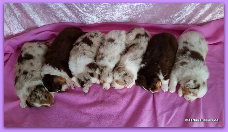 Sehr schöne red merle Hündin mit breiter Blesse und breitem geschlossenen Kragen. Sie trägt wie fast all ihre Geschwisterchen hinten Sneakers. Vorne beidseits lange Kniestrümpfe. Auch ihr Kupfer ist so, wie ich es liebe!