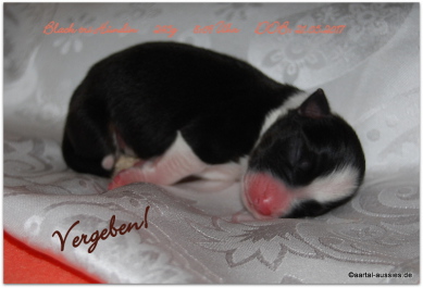 Hopie´s Erstgeborene ist eine zuckersüße black tri Prinzessin mit ebenmäßiger breiteren Blesse und einem Halbkragen rechts bis zur Mitte reichend. An ihren Vorderbeinen trägt sie hohe weiße Stiefelchen und an den Hinterfüßchen Sneakers.