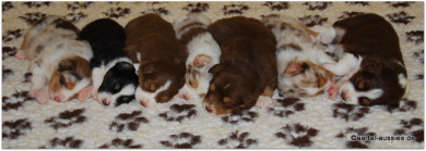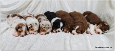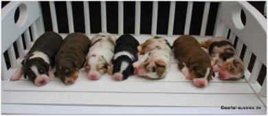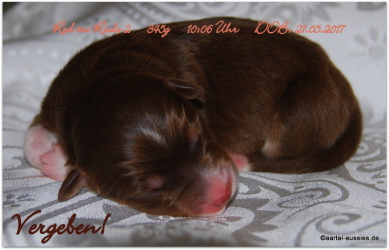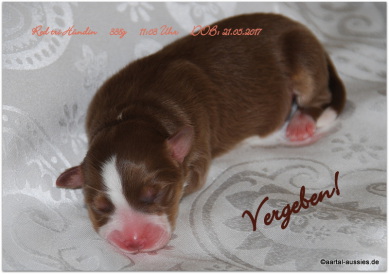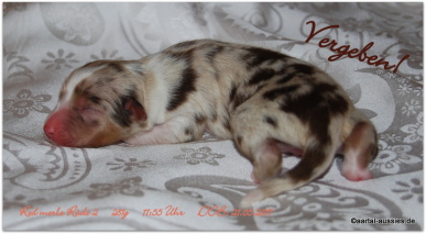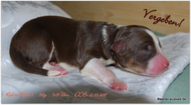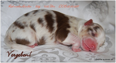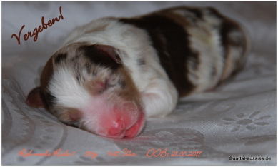 Ein red merle Bübchen wie gemalt. Neben seiner tollen breiten Blesse hat er zum Anbeißen süße Caramelbäckchen, einen weißen Kragen links, vorne hohe weiße Stiefel und hinten Sneakers. Von oben betrachtet schaut es aus, als habe er ein Schachbrettmuster auf dem Rücken.
