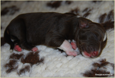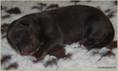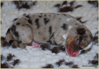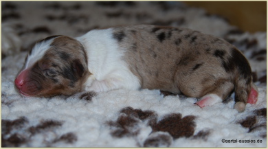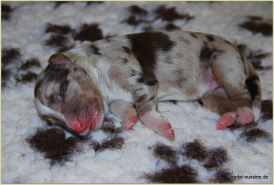 Schicker red merle Rüde mit gleichmäßiger Zeichnung. Er hat eine schöne Blesse, die bis in den schmalen durchgehenden weißen Kragen verläuft. Vorne hat er beidseits Stümpfchen an.