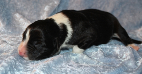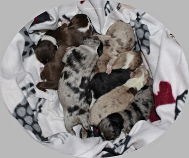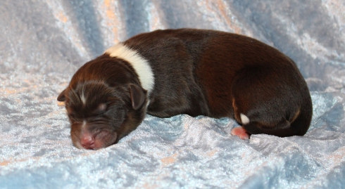 Das einzigste Bübchen in dem ganzen Mädelshaufen ist ein hübscher heller red merle mit schöner Blesse und weißem Kragen.