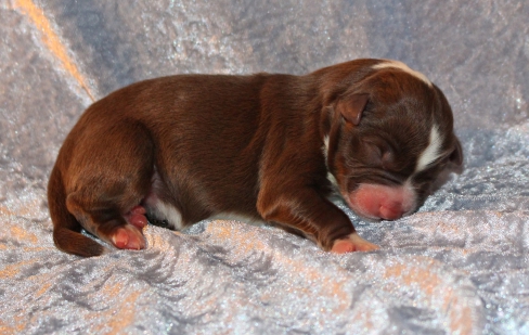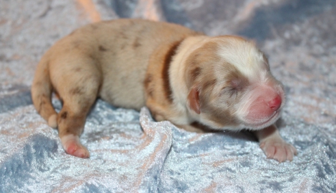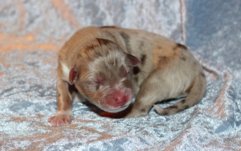 Das kleinste Mädchen hat eine Sonderlackierung in schönem red merle, welches in champagner leuchtet und mit einem Hauch Gold überzogen ist.