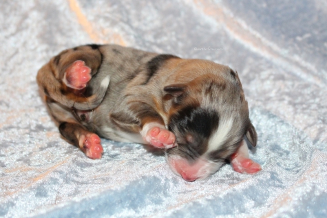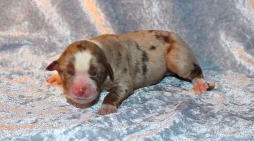 Diese hübsche red merle Hündin hat eine gleichmäßige Zeichnung und schönes Kupfer.