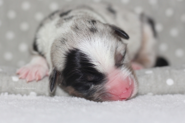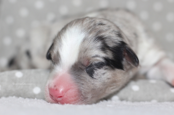 Niedliche blue merle Hündin mit einem großen Merlefleck rechte Gesichtshälfte.