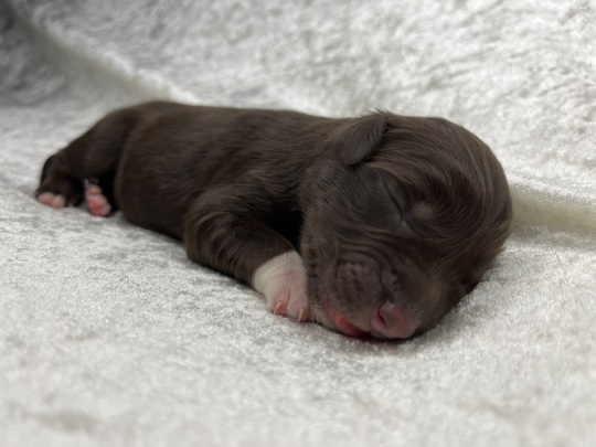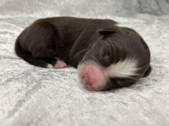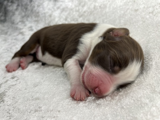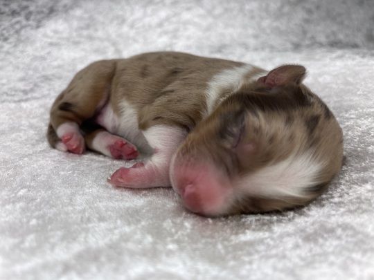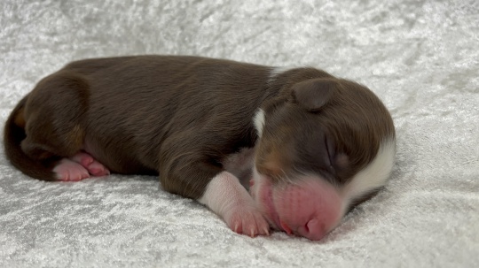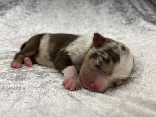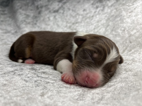 Zierlicher red merle Rüde mit schöner Kupferlackierung in seinem Gesichtchen. Vorne hochweiß gestiefelt, hinten mit Söckchen.