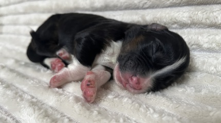 Süße black tri Hündin mit schönen Kupferbäckchen
