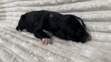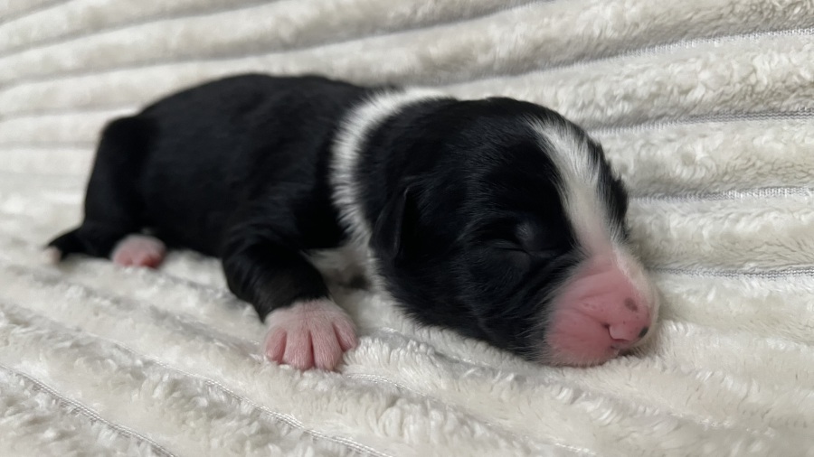 Toller black tri Rüde mit einer Sonderlackschicht überzogen
